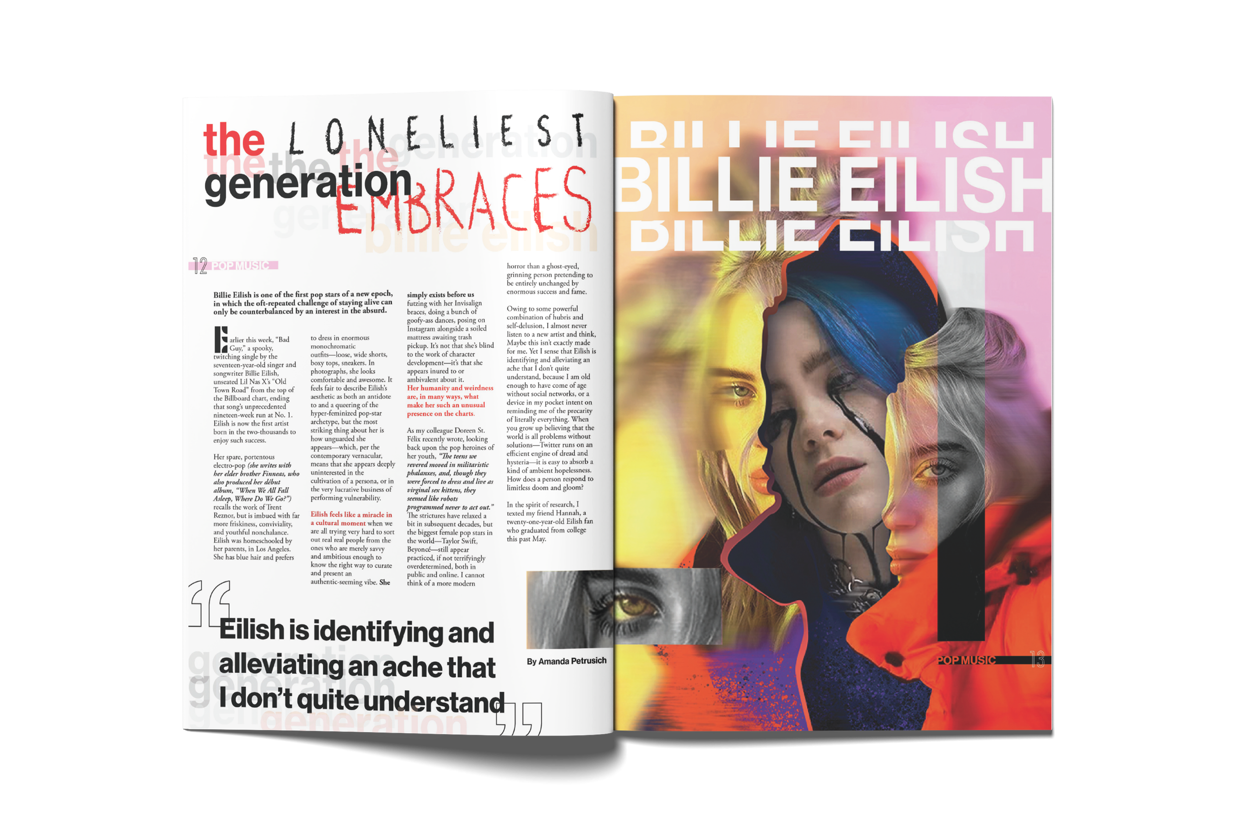 "Record" is a magazine focused on the evolution of music throughout each genre: pop, rock, jazz, and techno. For this particular issue, it focuses on Pop Music with a featured article by Amanda Petrusich, "The Loneliness Generation Embraces Billie Eilish."