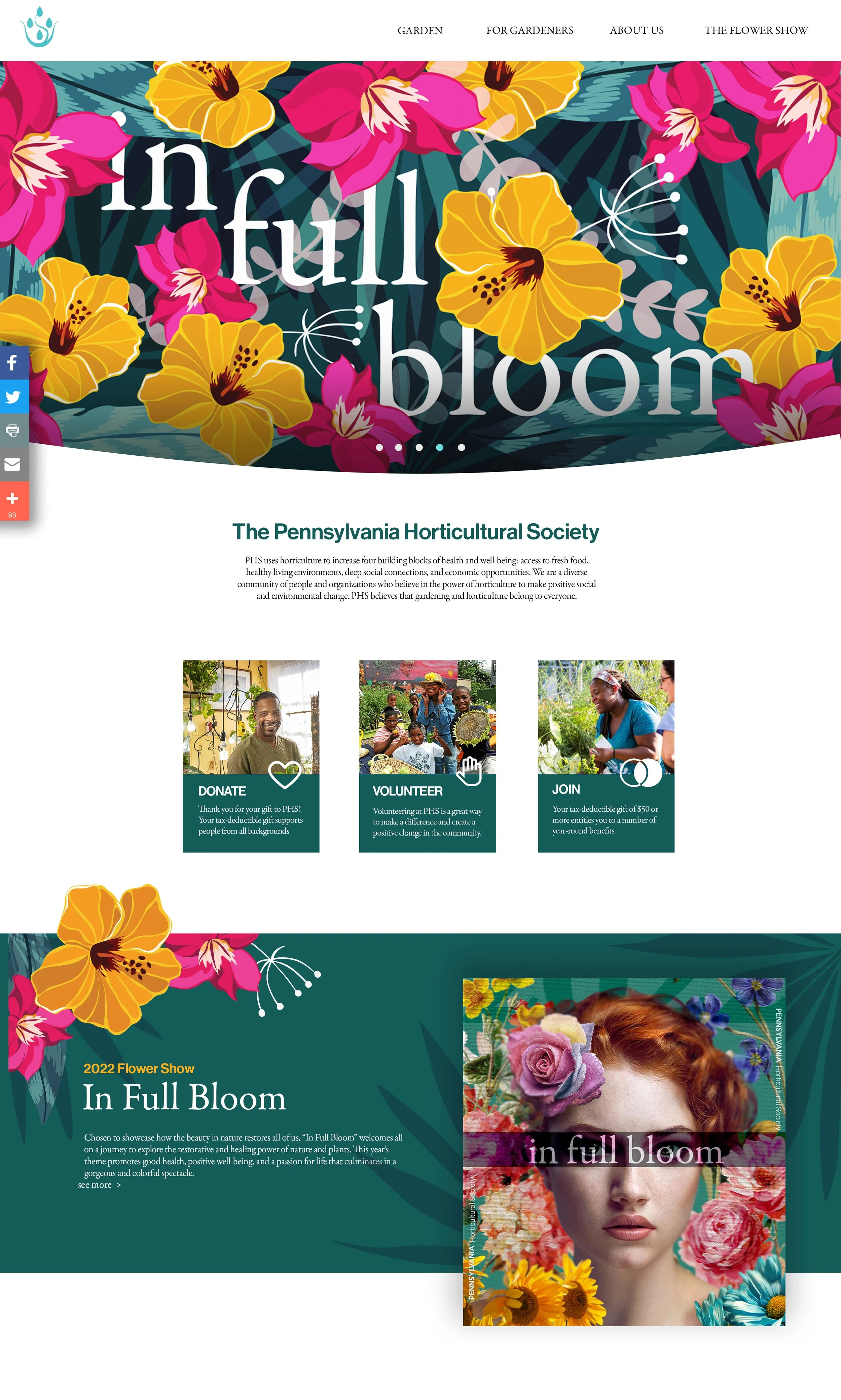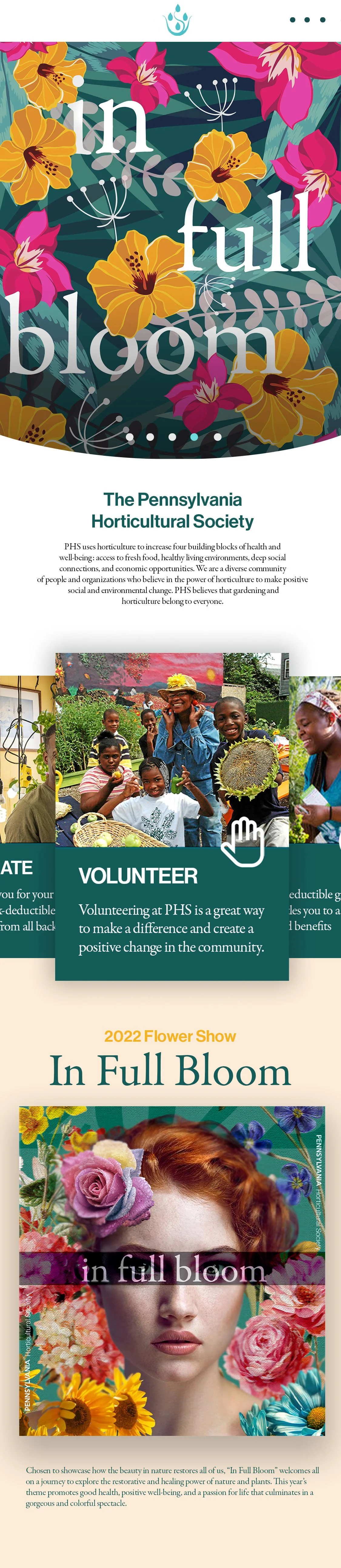 The Philadelphia Flower Show is an annual event produced by The Pennsylvania Horticultural Society (PHS). It is the oldest and largest indoor flower show in the world, attracting more than 250,000 people annually. In 2022, PHS was looking to rebrand their company and The Flower Show “In Full Bloom”.